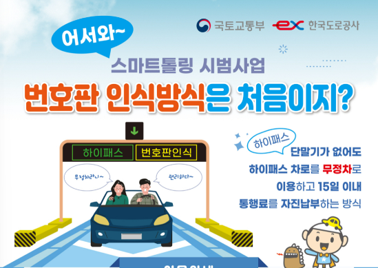 안녕하세요. 오늘은 국토교통부와 한국도로공사가 추진하는 '번호판 인식방식 스마트톨링' 시범사업에 대해 소개하려고 해요. 이 시스템은 하이패스 없이도 고속도로 통행료를 무정차로 납부할 수 있도록 하는 첨단 기술을 활용한 방식입니다. 이제 번호판 인식 방식 스마트톨링에 대해 자세히 알아보겠습니다.